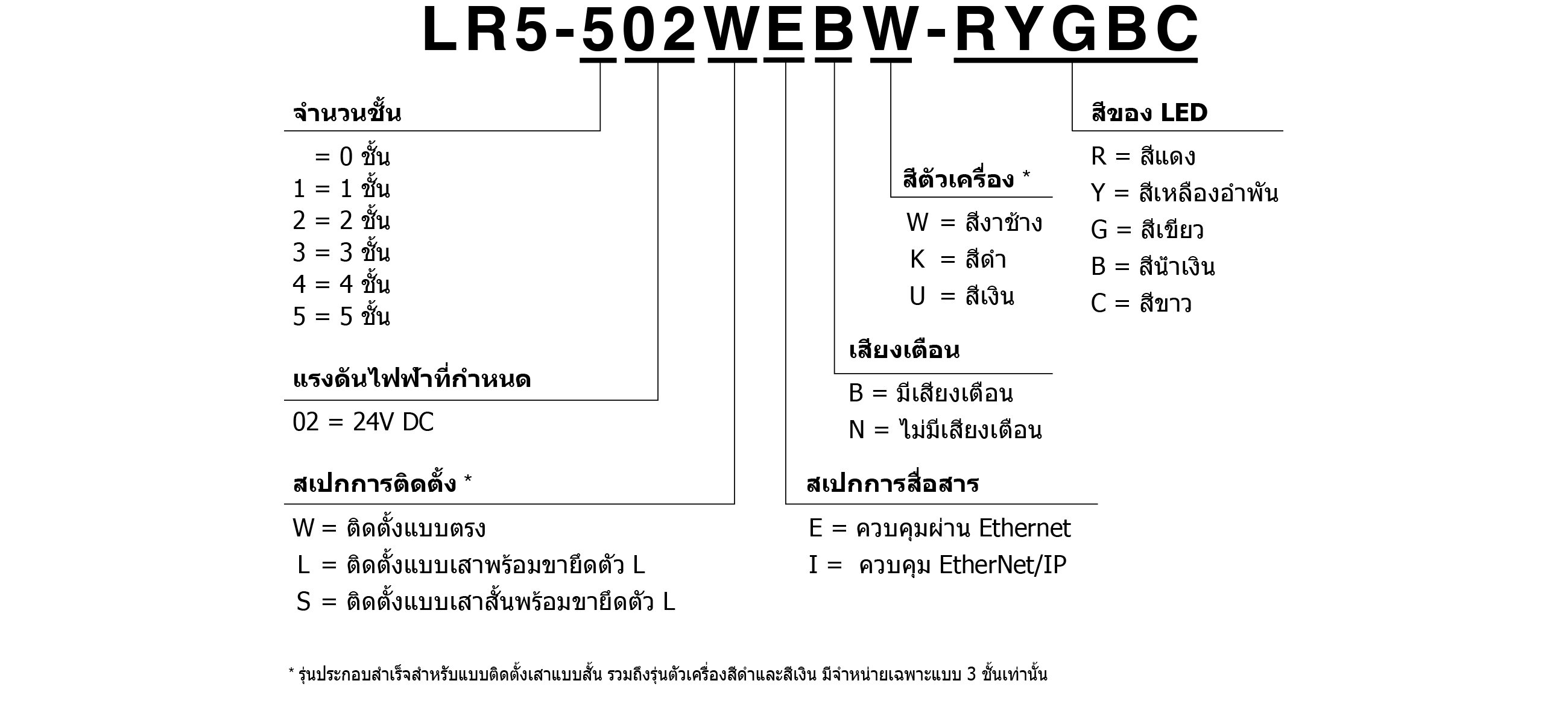 | LR5-502WEBW-RYGBC | 5 | 24 V DC | ติดตั้งแบบตรงด้วยสกรู 3 จุด | ควบคุมผ่าน Ethernet | มีเสียงเตือน | รองรับ | ขาวนวล | แดง, เหลือง, เขียว, น้ำเงิน, ขาว |